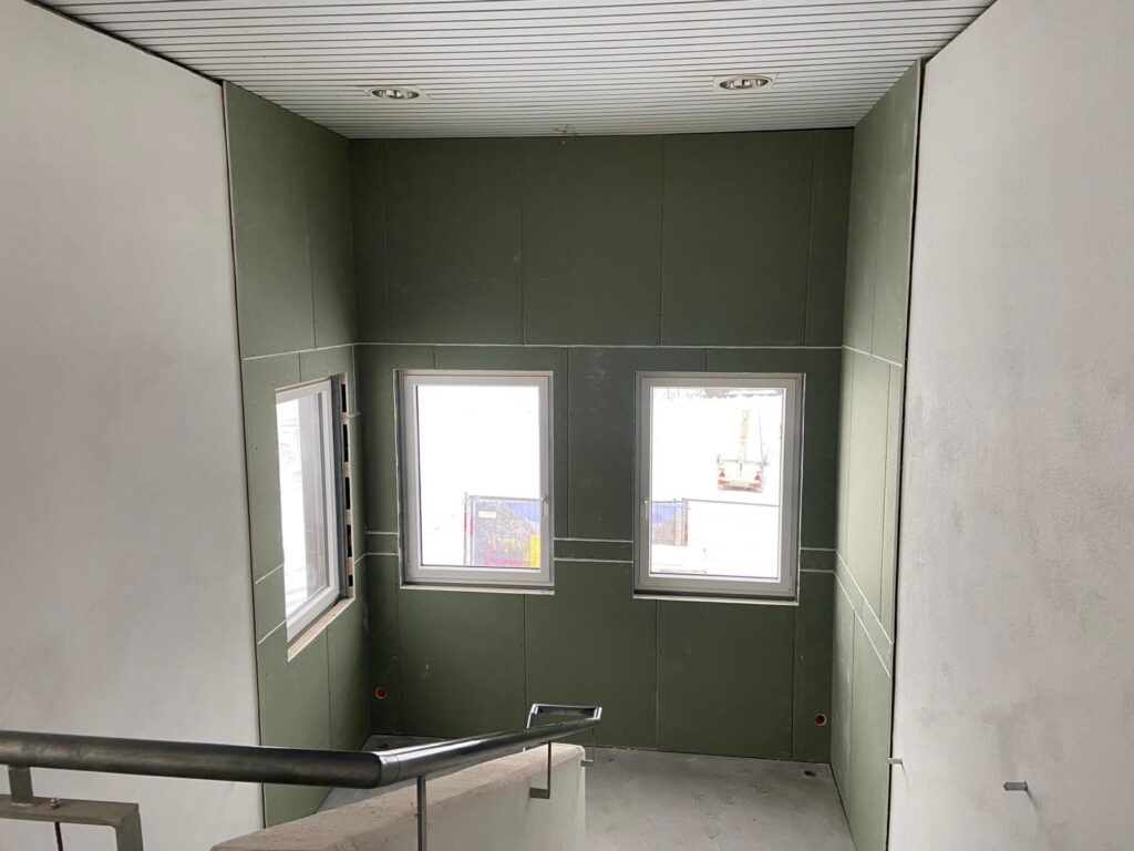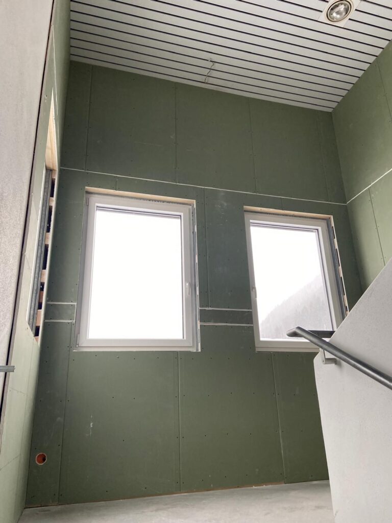 Die Zwischenwände wurden fertiggestellt und mit Trockenbauplatten versehen. Als Nächstes übernehmen hier die Maler und sorgen für frische, weiße Wände. Das Lager für den Saal ist ebenfalls bereits fertiggestellt. Der nächste wichtige Schritt: der Estrich – nachdem die Installationsarbeiten in diesem Bereich nun abgeschlossen sind. Das Stiegenhaus für den Gemeindesaalzugang wurde von den Feuerwehrkameraden ebenfalls bereits verkleidet.