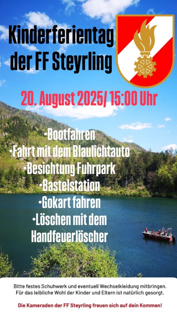 Die Feuerwehr Steyrling lädt euch herzlich zu einem spannenden Ferientag voller Action und Spaß ein.